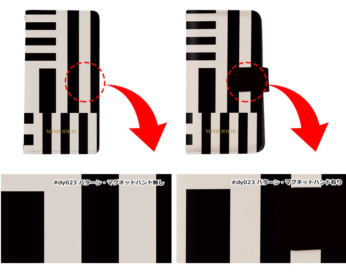 マグネットハンド部分のデザインと本体のデザインの絵柄が合うように努めておりますが、ご選択頂いた機種によって多少のズレが生じる場合があります。