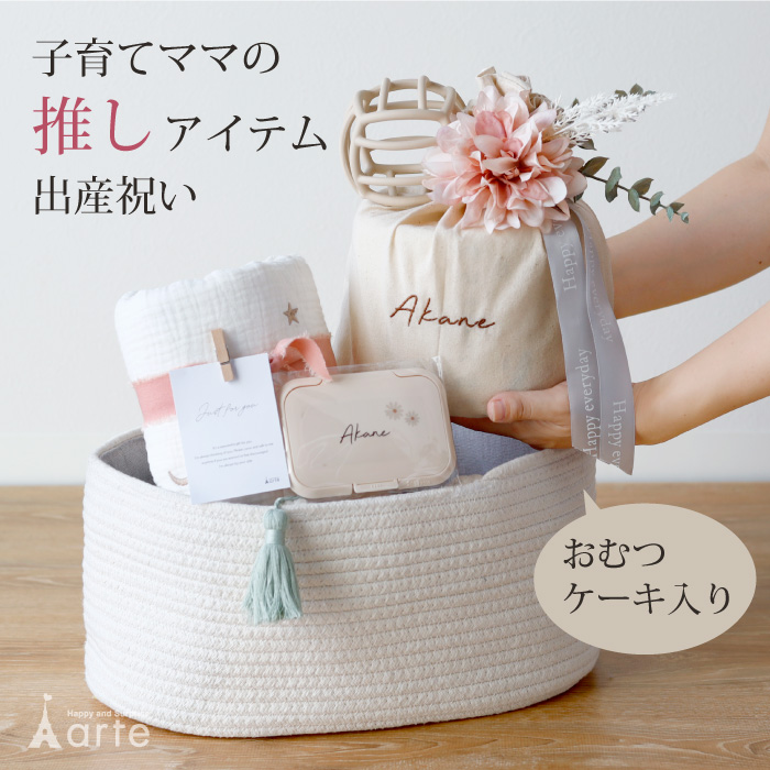 出産祝い おむつケーキ ナチュラルムーニー 男の子 女の子 名入れ 刺繍 バスケット ガーゼブランケット ギフトセット 巾着トート おしゃれ ラッピング ベビー