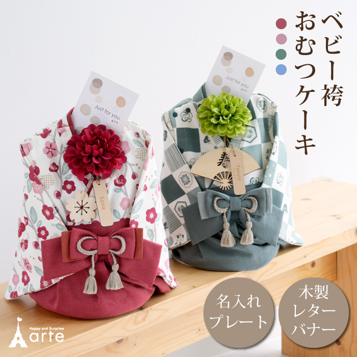 おむつケーキ 出産祝い ベビー袴 ロンパース 70サイズ 男の子 女の子 木製 レターバナー 名入れ ネームプレート 百日祝い お宮参り お食い初め 初節句 ギフト