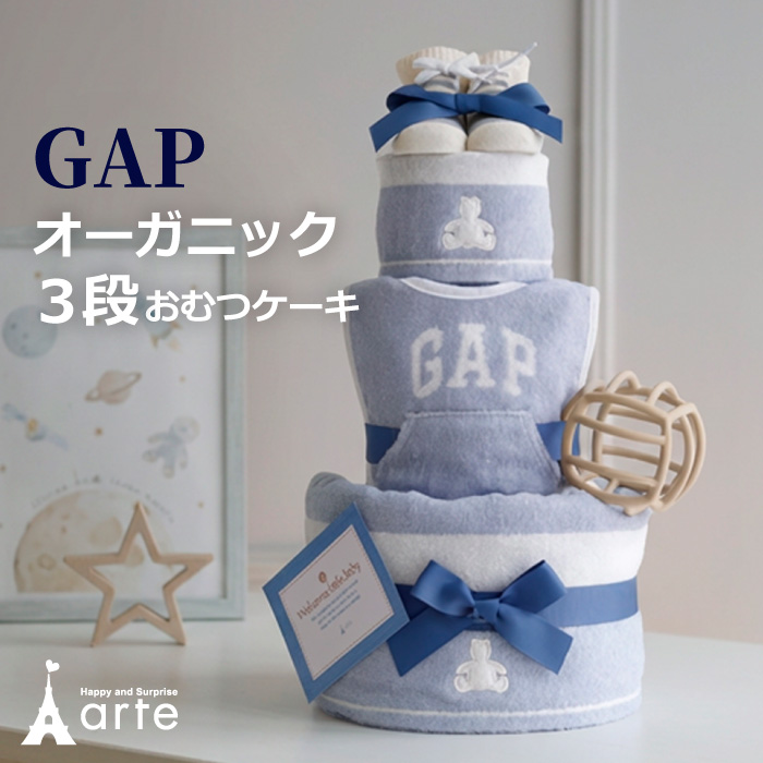 出産祝い おむつケーキ GAP 男の子 女の子 名入れ 3段 オーガニックコットン タオル スタイ ベビーソックス ギャップ baby シリコンボール 刺繍 ギフト