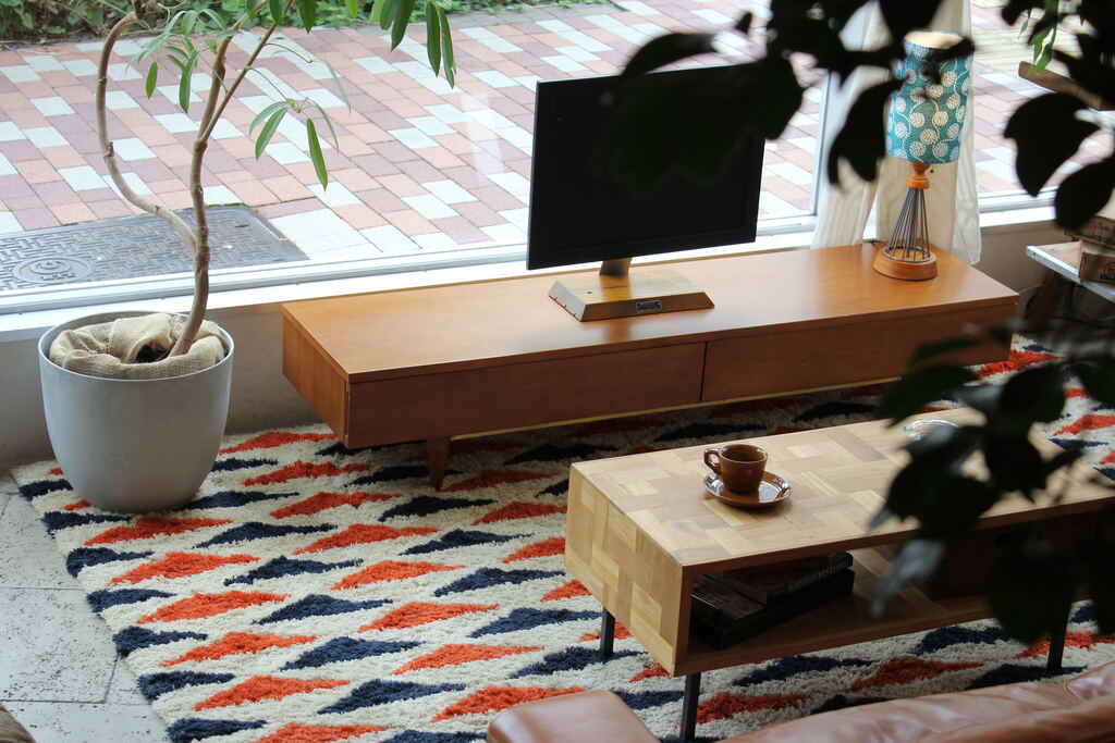 TV BOARDの両サイドは10?~30?余裕を持たせてあげるとバランスが綺麗に見え、テレビボードの横にも植物や照明などを置くことが出来、おしゃれな雰囲気に。