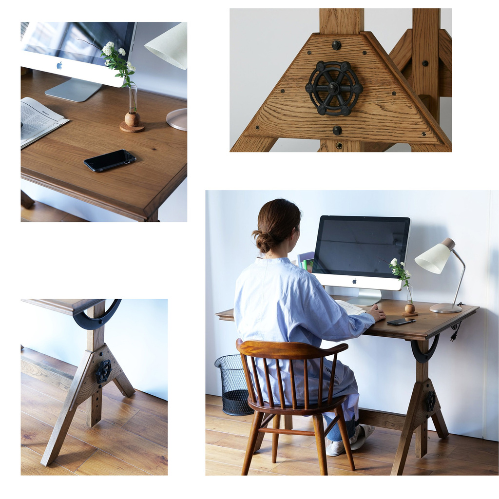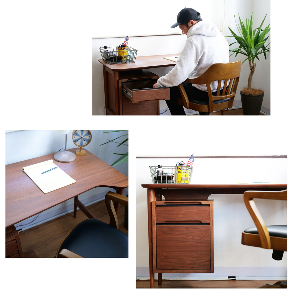 PCを使うデスクで一般的なサイズ感でデスクワークをされる方にもご使用頂きたいと思い、開発。片方に書類やデスク周りの細かい物を収納するための抽斗が付いているためデスク回りの細かい小物や書類などをしっかり収納できます。