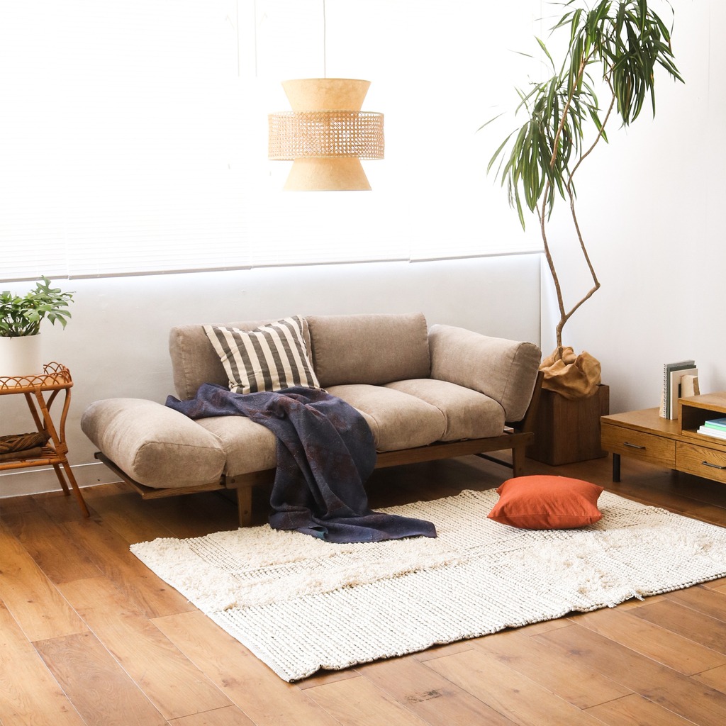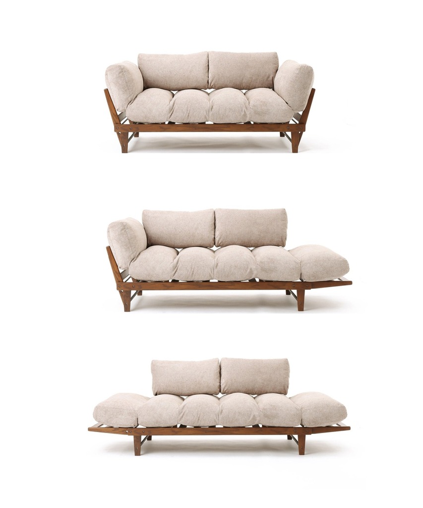 左右のアームを手動で簡単に動かして座面がフラットになる機能ソファ。