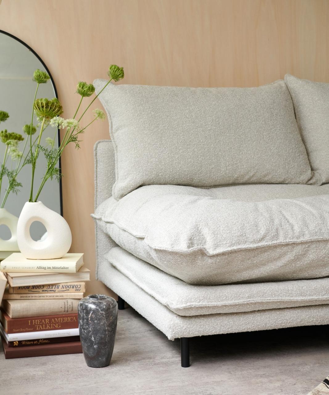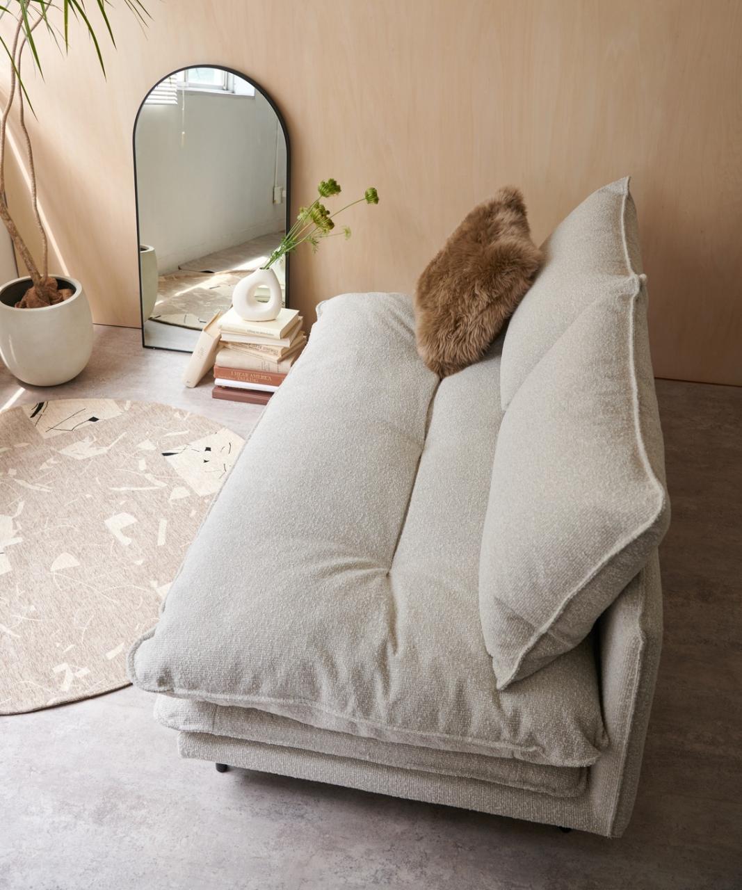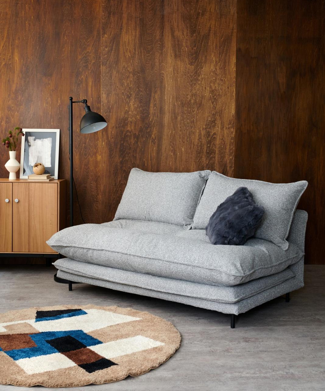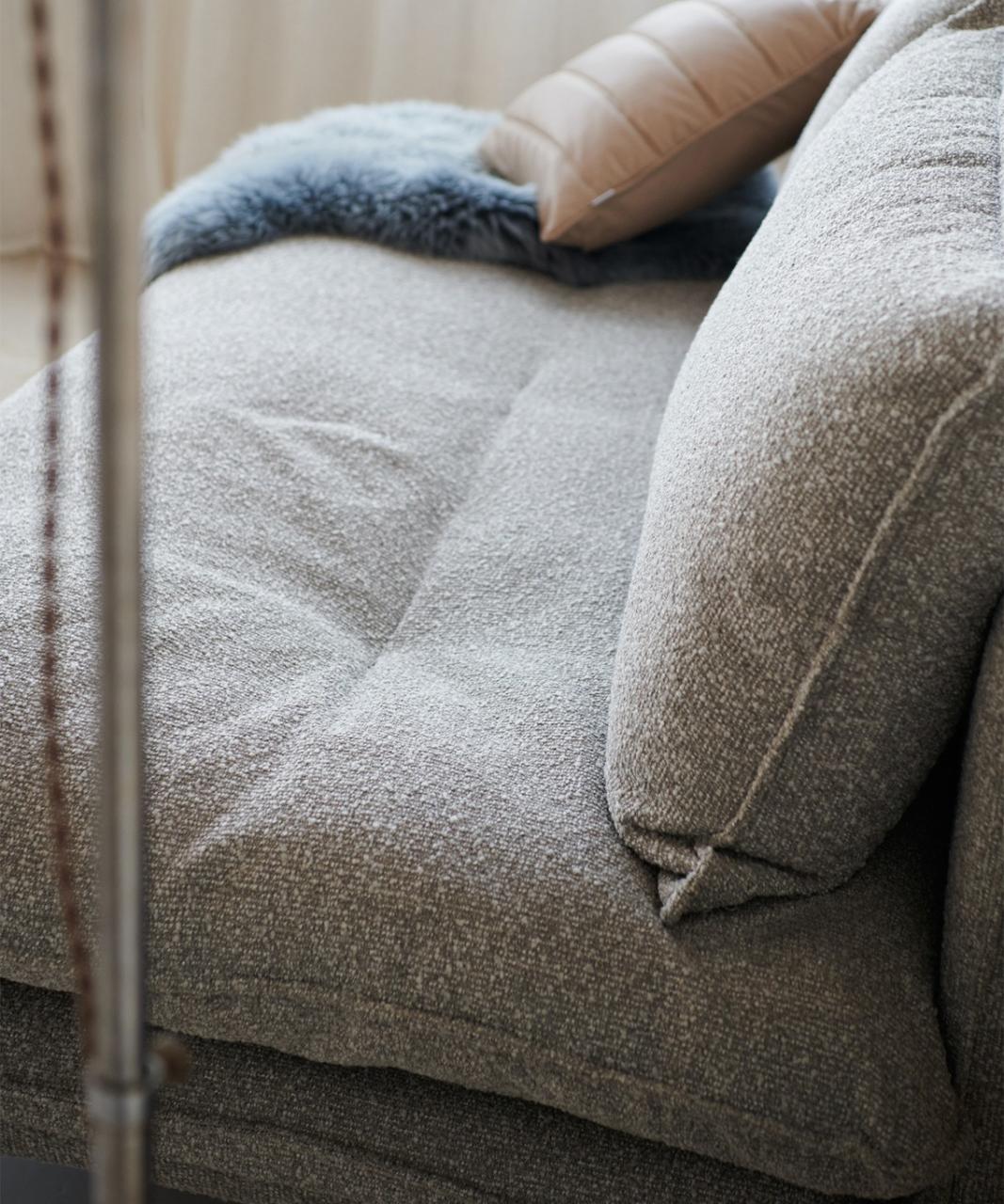 座面に一般的なソファよりも厚みを持たせ、構造もポリエステル綿と比重の高いウレタンを 何層にも重ねることで身体の重さを沈み込みながら全方向柔らかく受け止め分散し、まるで雲の上でくつろぐような、優しい座り心地です。