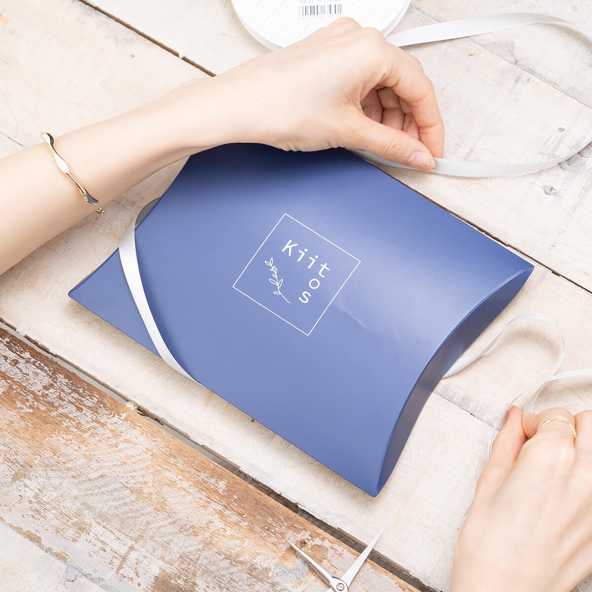 ネイビーベースの無地包装紙または当社ロゴ入りの包装紙でお包みいたします。