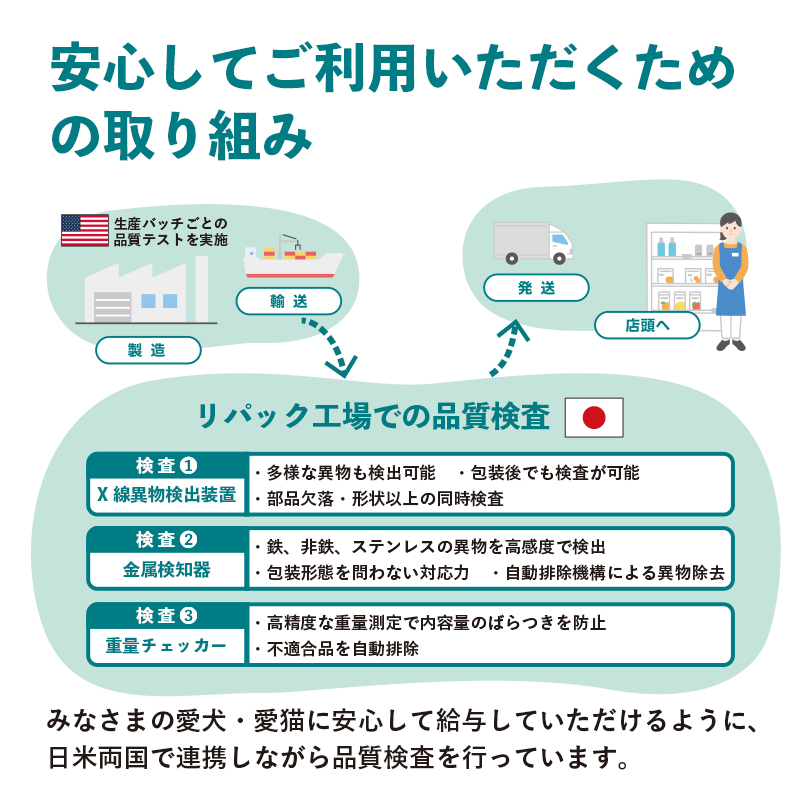 米国より輸送されたフードは日本の工場で全て機械によって、日本用規格にあわせて計量され、日本用パッケージにリパックされます。米国での製造時には生産バッチごとに品質テストが実施されますが、輸送時やリパックする際の規格外品や異物混入がおこらないよう、日本でも独自の検査を実施しています。